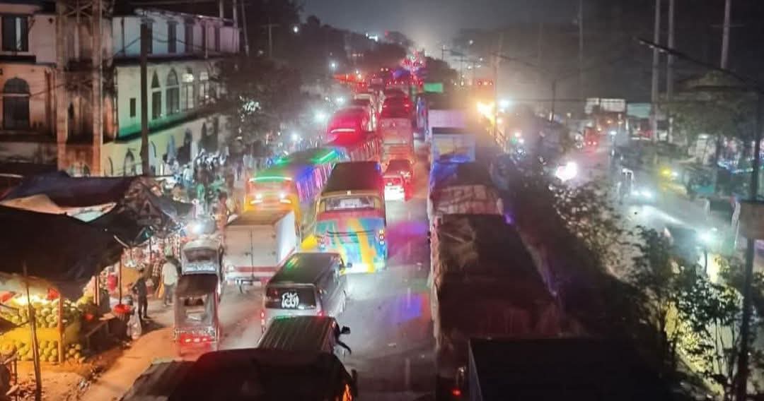 মঙ্গলবার (১৭ মার্চ) সন্ধ্যার পর থেকে দেখা যায়, হঠাৎ করেই যাত্রী ও যানবাহনের চাপ কয়েকগুণ বেড়ে যায়। ফলে ঢাকা–টাঙ্গাইল মহাসড়ক এবং চন্দ্রা-নবীনগর সড়কের প্রায় ১০ থেকে ১২ কিলোমিটারজুড়ে দীর্ঘ যানজট দেখা দেয়, যা বাড়ি ফেরা মানুষের ঈদযাত্রাকে করে তুলেছে দুর্বিষহ।